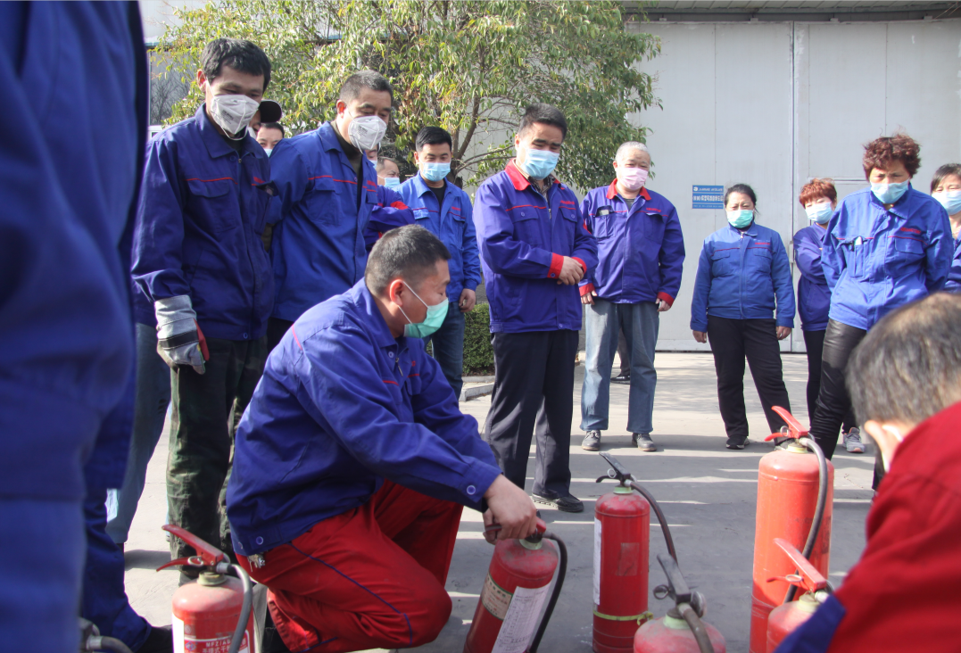 公司生产常务副总经理姜广涛任本次演练总指挥、副总经理赵逢佩任副总指挥,参加演练其他人员有安全生产管理领导小组成员6人、车间主任4人、各车间员工代表28人。消防演练共分为两个阶段,第一阶段为对员工进行消防安全知识培训,演练开始前姜总对本次演练进行总体部署及演练中应该注意的安全事项。安全管理员曹长富向参练人员讲解灭火器的种类及型号,以及不同种类、型号灭火器的正确操作方法。