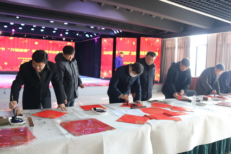 金兔留迹去,龙腾迎新春。2月5日,在甲辰龙年新春佳节来临之际,为传承中华优秀传统文化、营造欢乐祥和的节日氛围,以书法艺术的形式,增强职工群众文化获得感、幸福感,由济宁市文联、济宁市作协、济宁市书协、大鲁艺书画院共同主办的“2024年春节‘万福迎春’走进祥通书法惠民活动”在祥通多功能厅成功举行。济宁市文联党组书记、主席张作昌,济宁市文联党组成员、副主席黄秀杰;济宁市书协主席谢长伟,中国书协会员、济宁市书协秘书处成员高卫兵,济宁市女书画家协会秘书长晋丹;济宁市作协主席张建鲁,副主席范金泉、副秘书长周中祥,济宁经开区作协副主席纪秀目;大鲁艺书画院党支部书记、常务副院长张瑞祥,大鲁艺书画院副院长王尽文、王大中,兖州区文联原主席张金鹏和祥通职工代表、媒体记者齐聚一堂,现场题写春联福字,喜迎龙年春节。
