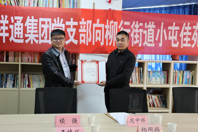 随后,祥通集团党支部书记李勉祥向小屯村党支部书记王培兴同志现场捐赠了图书,柳行街道党工委委员、宣传委员杨同锡同志向祥通集团总经办主任续强颁发了捐赠证书。